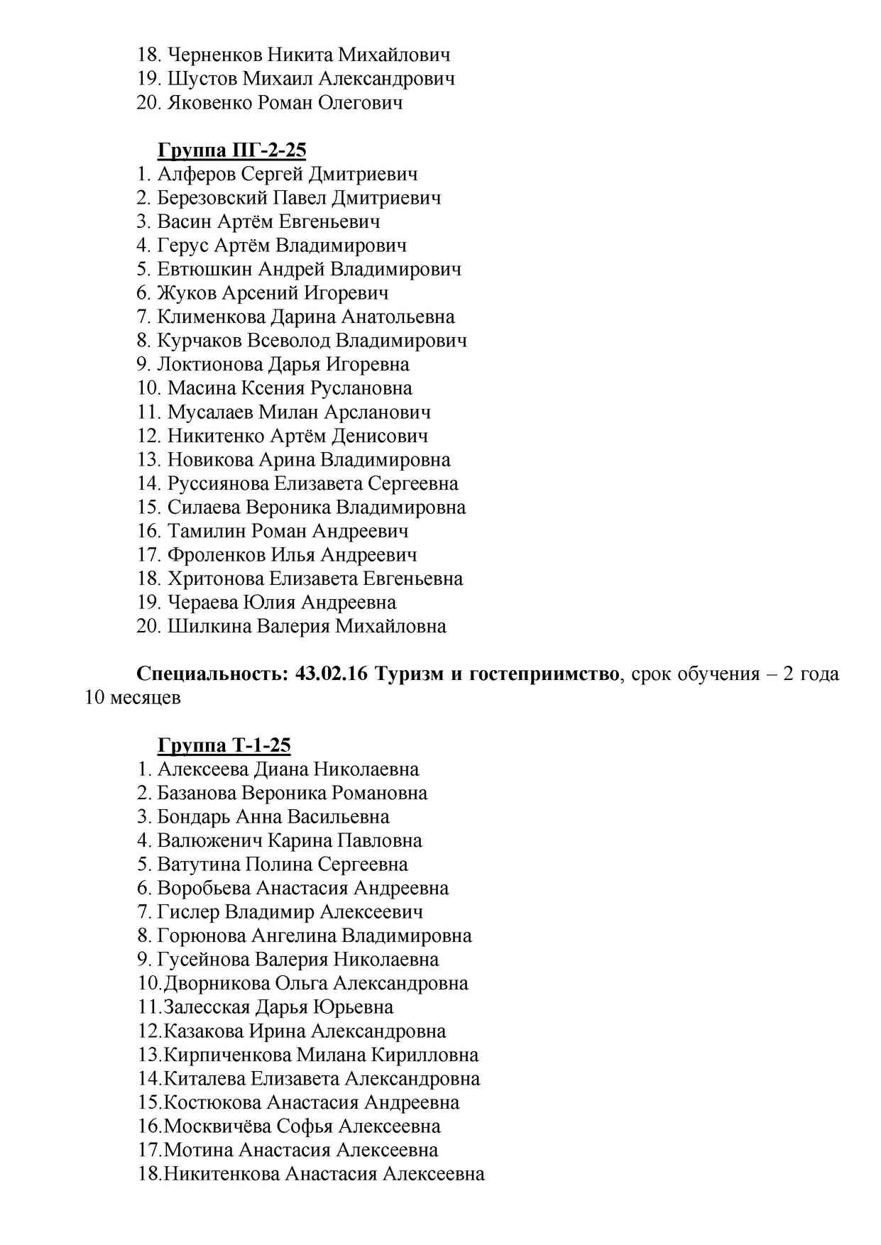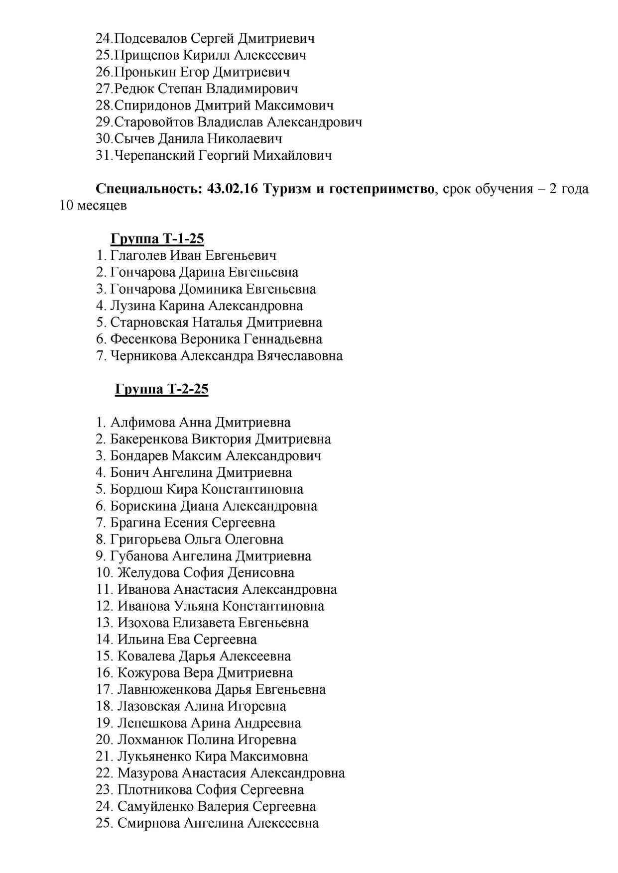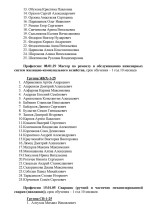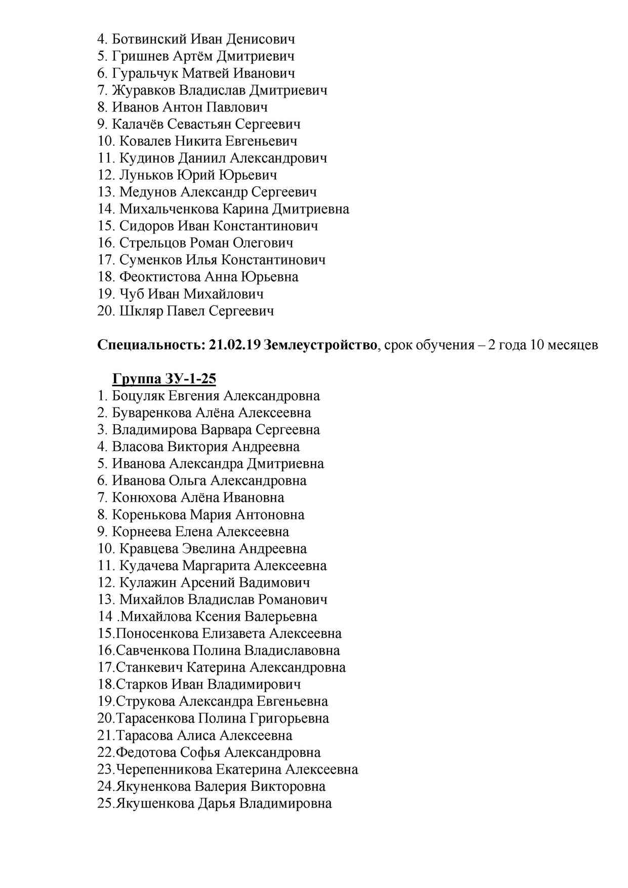 Списки абитуриентов, зачисленные на места, финансируемые из областного бюджета, в соответствии с дополнительными контрольными цифрами приёма