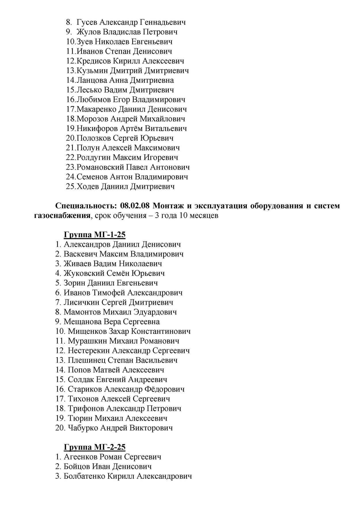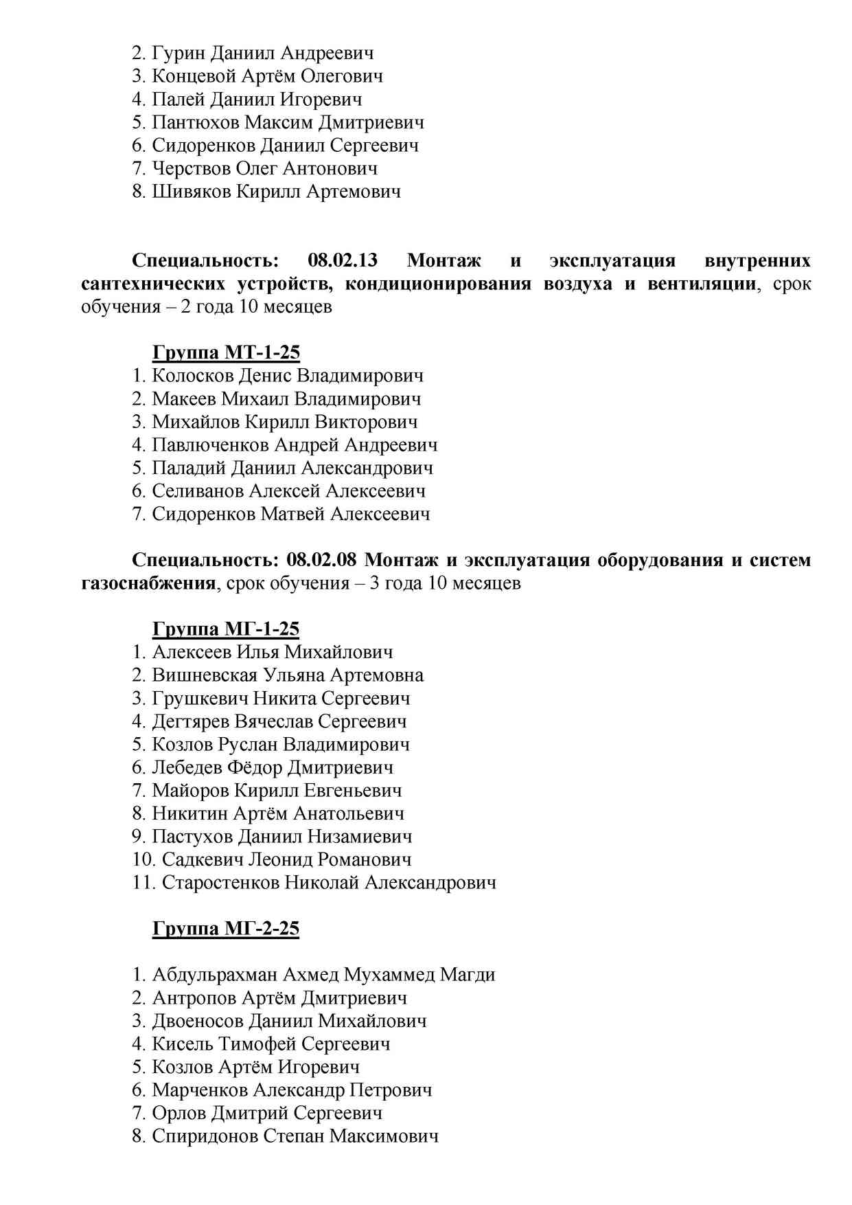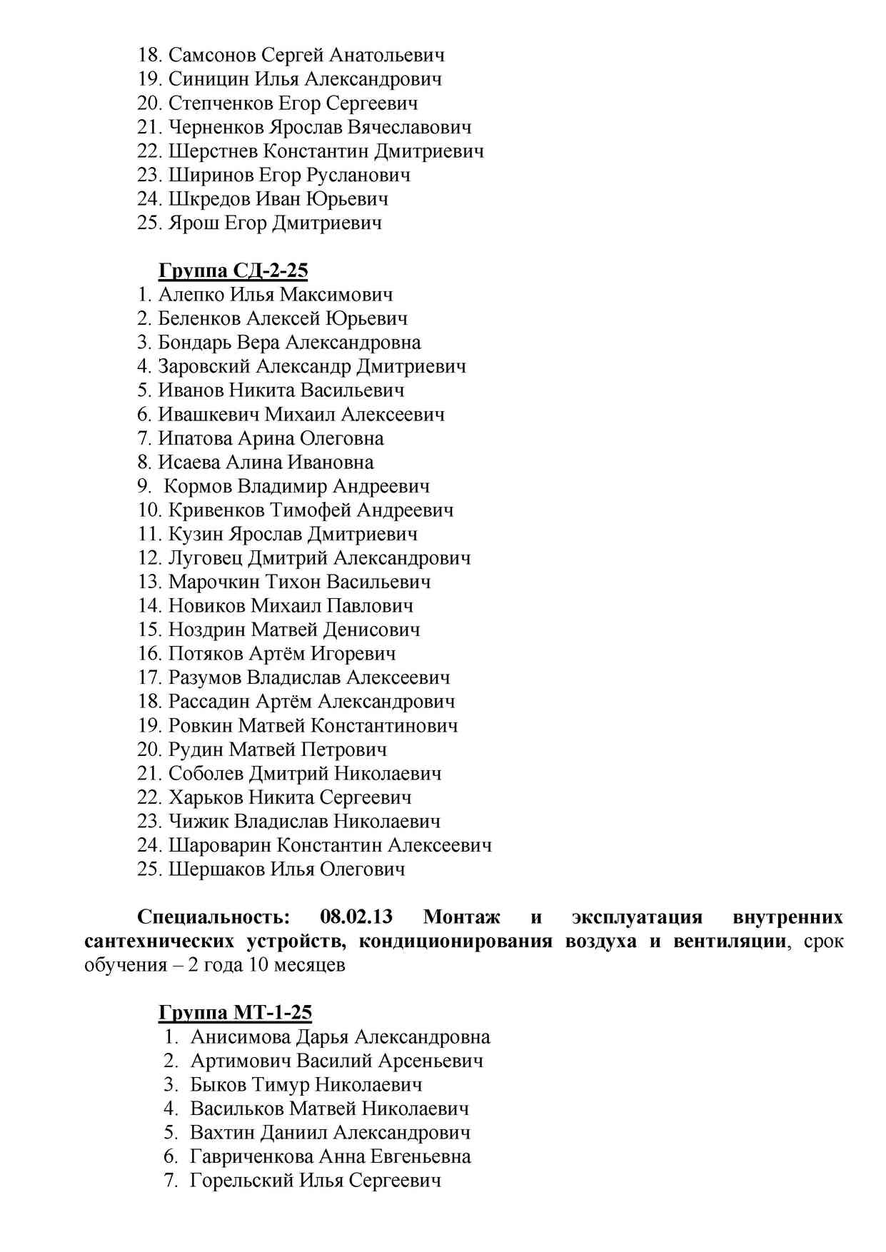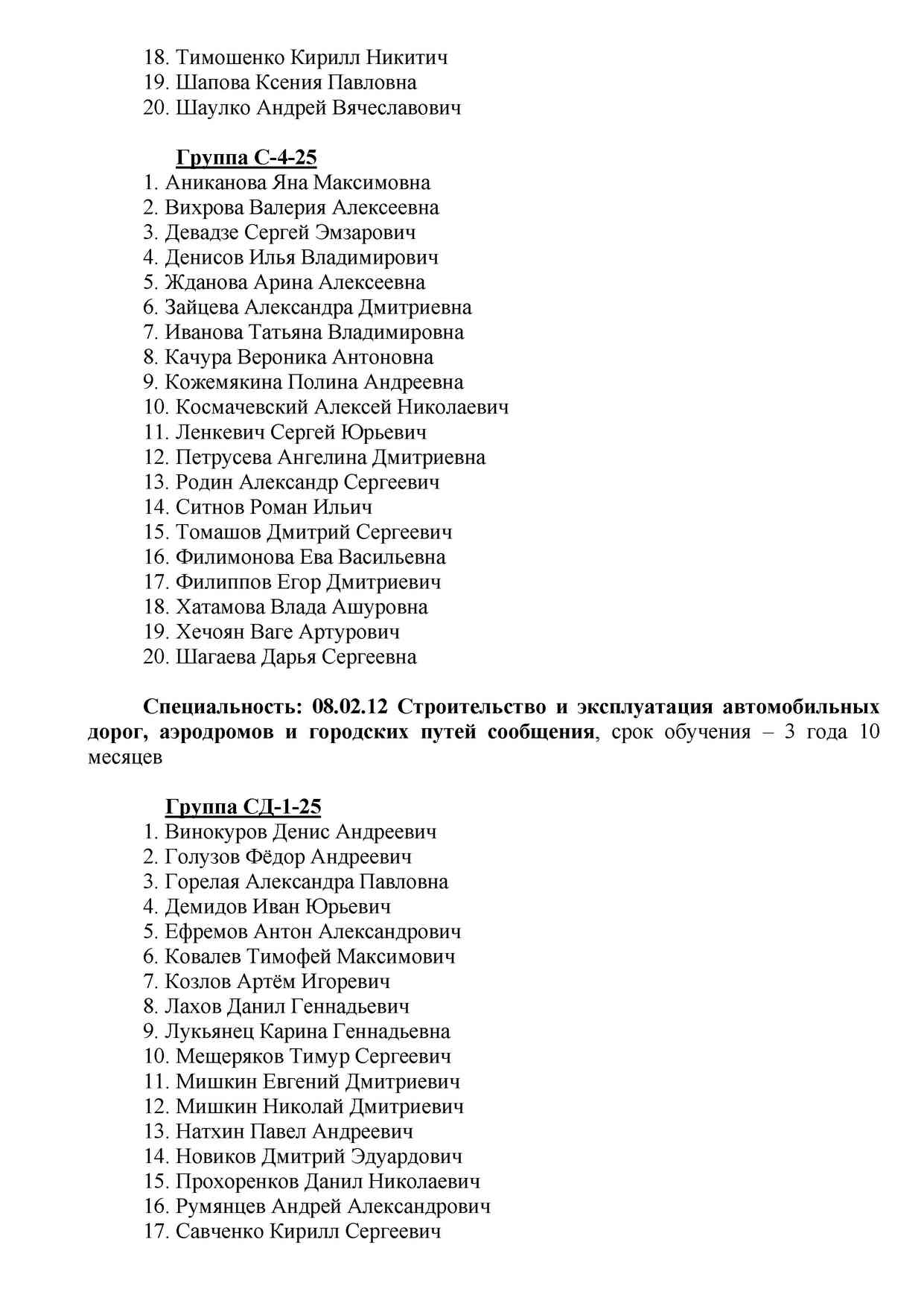Списки абитуриентов, зачисленные на места, финансируемые из областного бюджета, в соответствии с дополнительными контрольными цифрами приёма