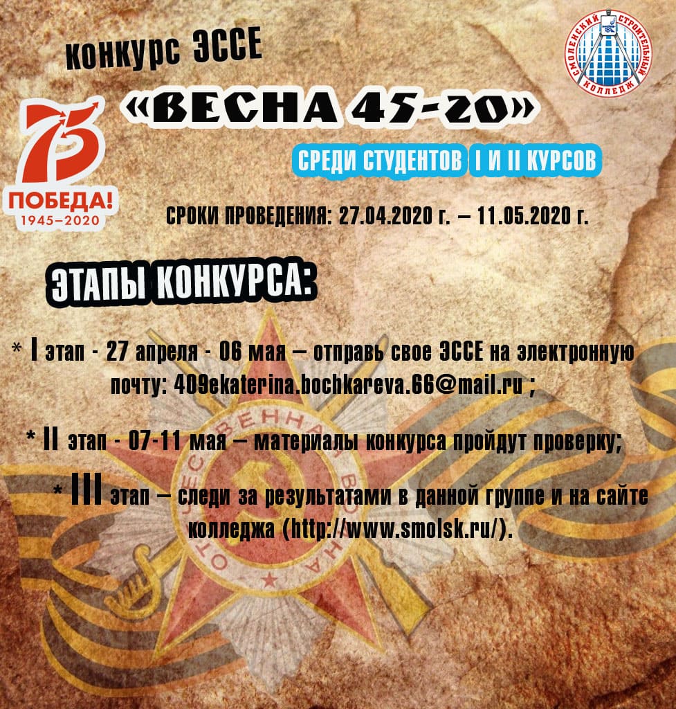 С 27 апреля по 12 мая проходит конкурс эссе «Весна 45-го» Конкурс направлен на повышение социальной, патриотической и общественной активности студентов.