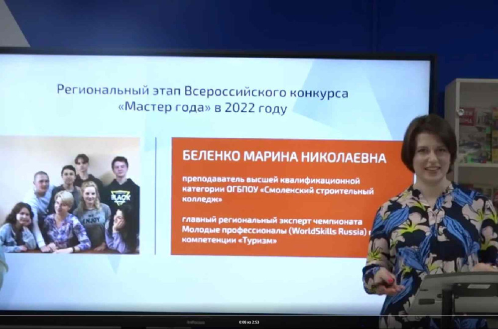 2. конкурсное мероприятие № 2 «Открытый мастер-класс» - учебное занятие с группой обучающихся продолжительностью 45 минут. Мастер-класс, проводимый М.Н. Беленко, основывался на применение преподавателем технологии педагогической (творческой) мастерской. Тема мастер-класса: «Построение экскурсионного маршрута по Смоленску «История одного города»».