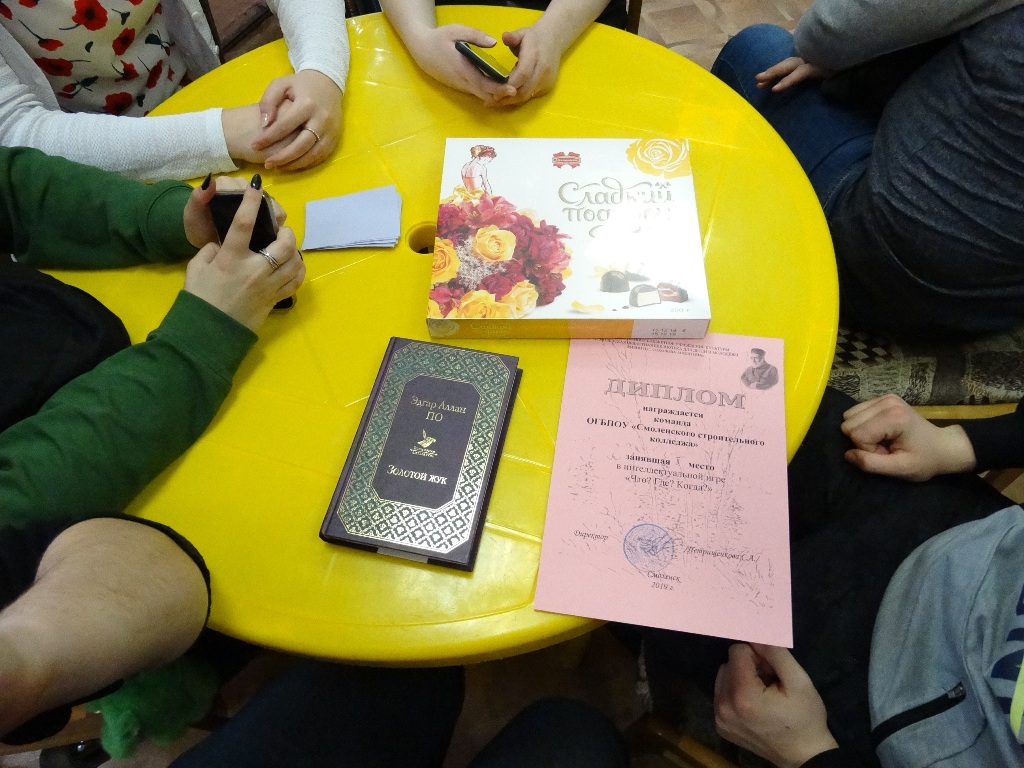 В ходе игры ребята отвечали на различные вопросы, связанные с литературой, историей, естественными науками, логикой и географией; за каждый правильный в копилку команды добавлялся один балл. «Знатоки» работали слаженно, с большим энтузиазмом отвечали на вопросы и изо всех сил рвались к победе. По итогам соревнования наша команда заняла второе место и получила сладкий приз.