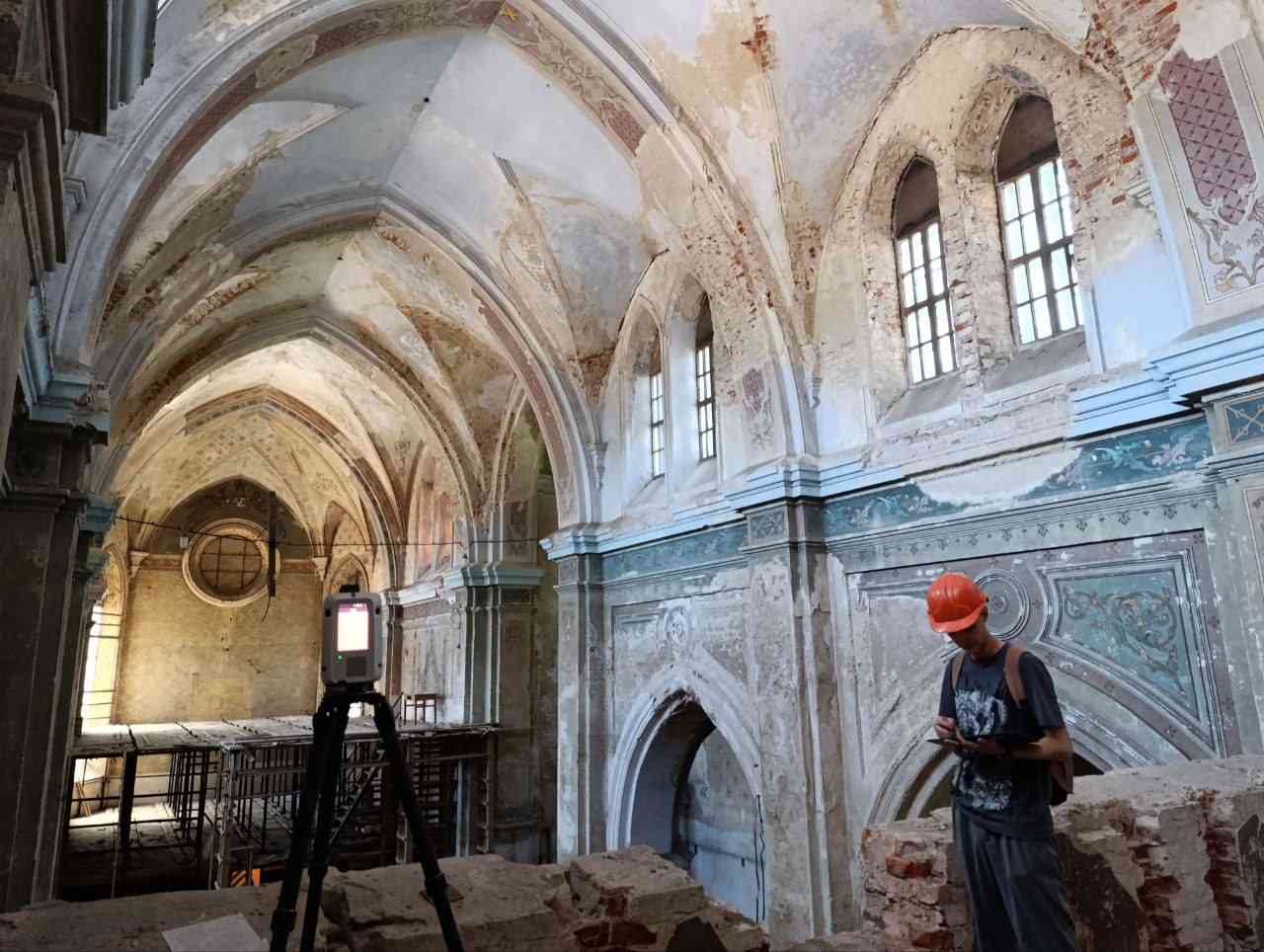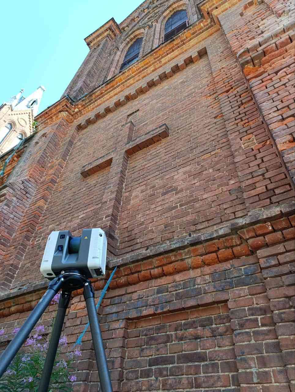 Обмерочные работы храма, сооружëнного из тëмно-красного кирпича выполнялись методом лазерного 3D сканирования, при помощи лазерного сканера.