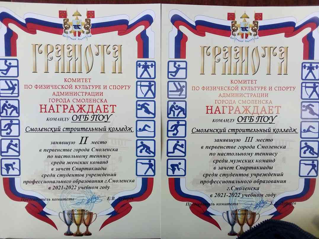 13 и 14 октября в МБУ «Спортивная школа им. М.В. Николина» прошли соревнования по настольному теннису в зачет Спартакиады обучающихся ПОО г. Смоленска. Команда девушек в составе Пикун Марины (ЗОУ-1-20), Пешкиной Ангелины (ЗОУ-1-20) и Грековой Алины (Э-1-19) заняли IIместо! Команда юношей в составе Литвинова Максима (Э-1-19), Андреева Александра (СД-1-20) и Клухина Павла (С-1-11-21) в упорной борьбе заняли IIIместо! Поздравляем команды с отличным выступлением и пожелаем им дальнейших успехов!
