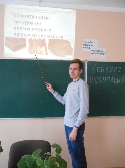 В рамках проведения недели общеобразовательных дисциплин 27 февраля 2017г. на площадке №2 был проведён конкурс презентаций. В конкурсе участвовали студенты первого курса группы СТ-1-16; ЭГС-1-16 под руководством преподавателя химии и биологии Радионовой С.П.