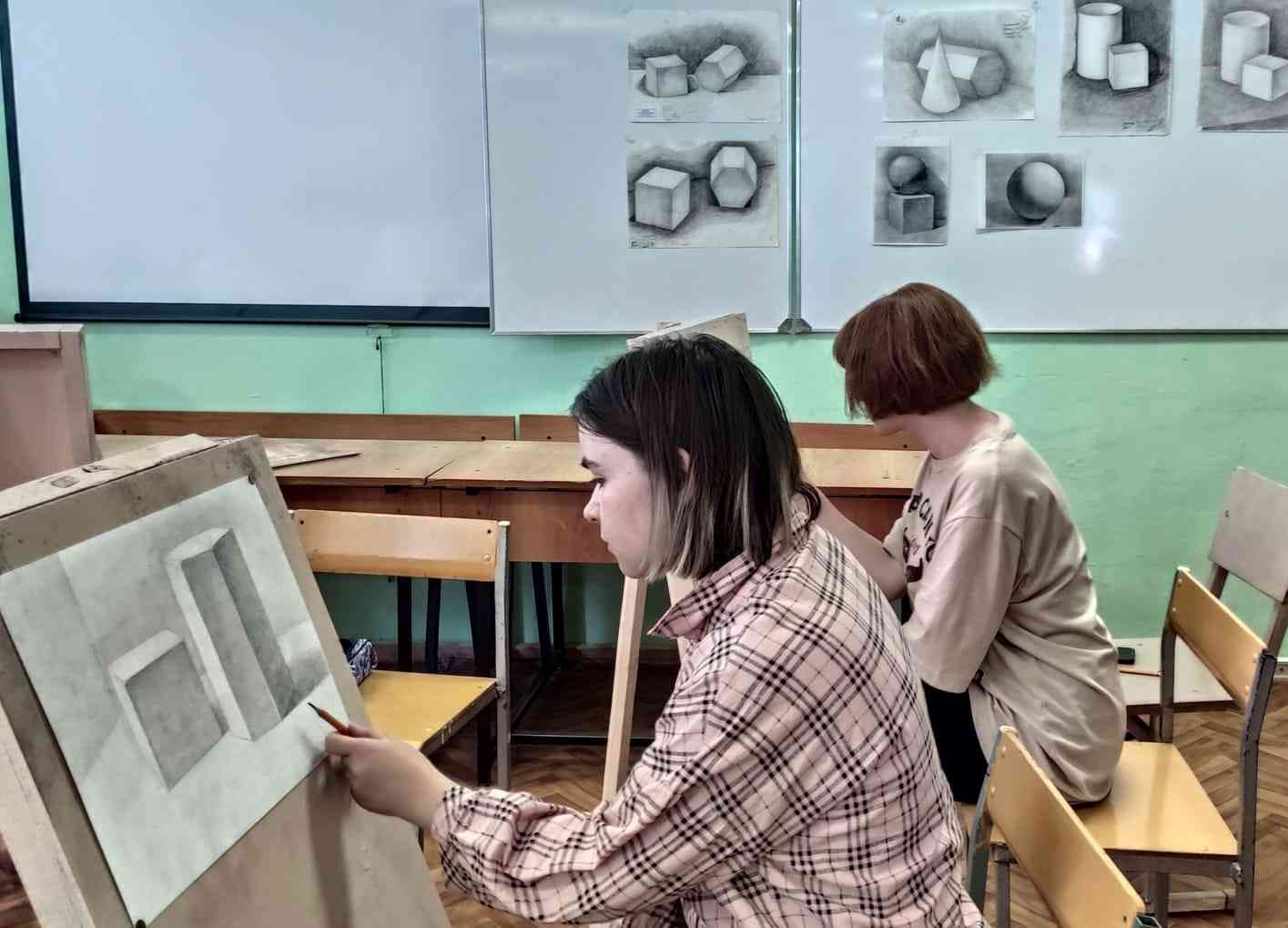 Абитуриенты под руководством преподавателя специальности 07.02.01 Архитектура Елены Анатольевны Прохожевой выполняют рисунки групп гипсовых геометрических тел. Начинают с изображения простых гранных форм, далее приступают к изображению более сложных тел вращения. Учатся выполнять штриховку, создавать объем, делать изображение наглядно-образным и выразительным.