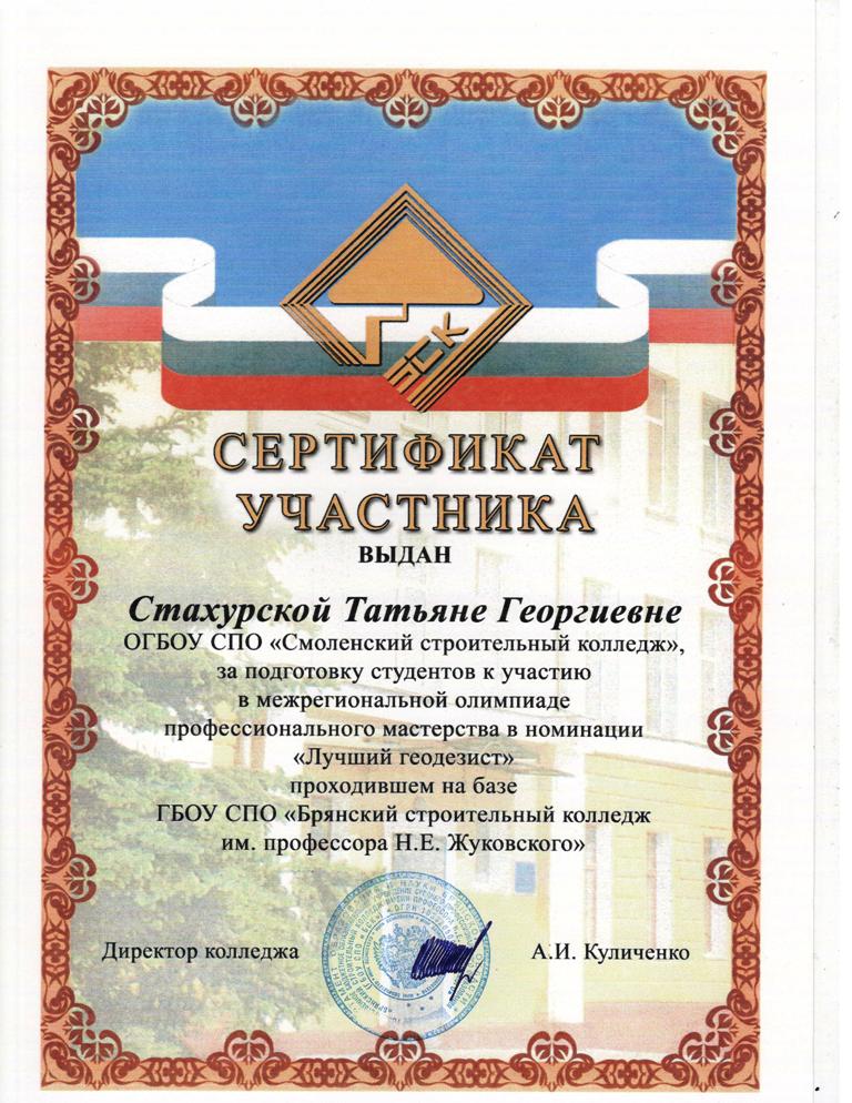 19 марта 2015 г. В г. Брянске состоялась межрегиональная олимпиада профессионального мастерства по специальности 08.02.01 (270802) Строительство и эксплуатация зданий и сооружений для обучающихся средних профессиональных организаций Брянской, Смоленской и Калужской областей. В олимпиаде принимали участие обучающиеся ОГБОУ СПО «Смоленский строительный колледж» В.А. Власов и О.А. Захаренкова.