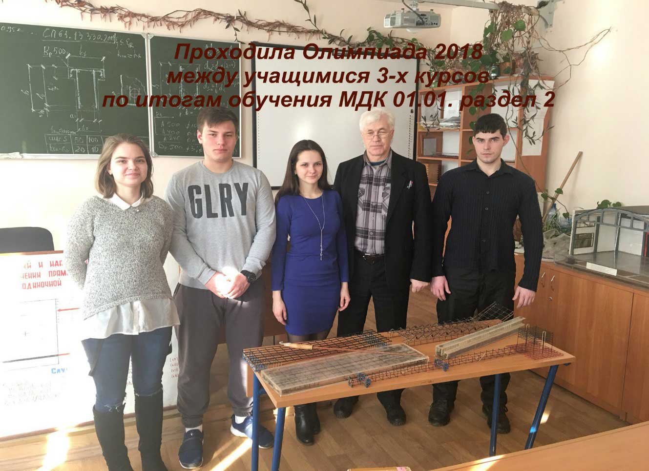 - Олимпиада под руководством В.Я. Пилипенко по теме «Особенности строительных конструкций» среди групп специальности 08.02.01 Строительство и эксплуатация зданий и сооружений, была проведена 11.04.2018г.