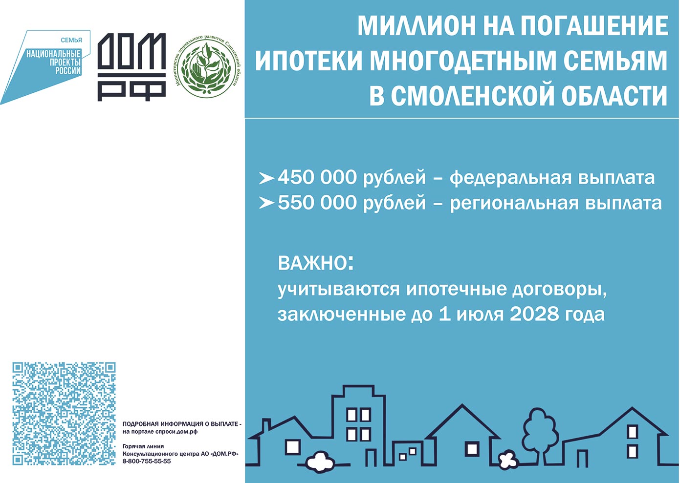 Данная мера регулируется Областным законом от 27 февраля 2025 года № 26-з «О мере социальной поддержки семей, имеющих детей, в части погашения обязательств по ипотечным жилищным кредитам (займам) на территории Смоленской области».