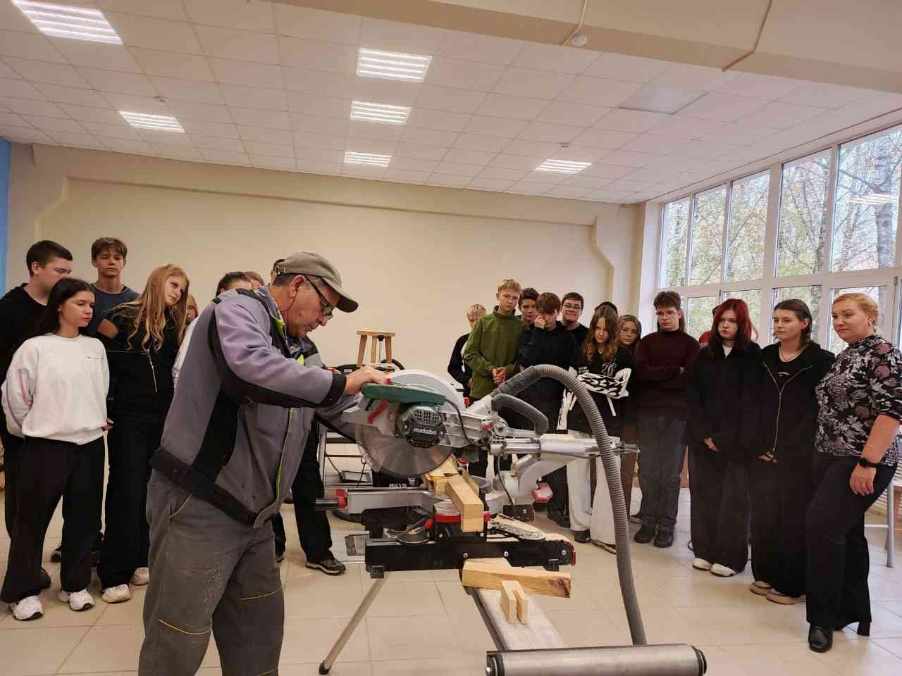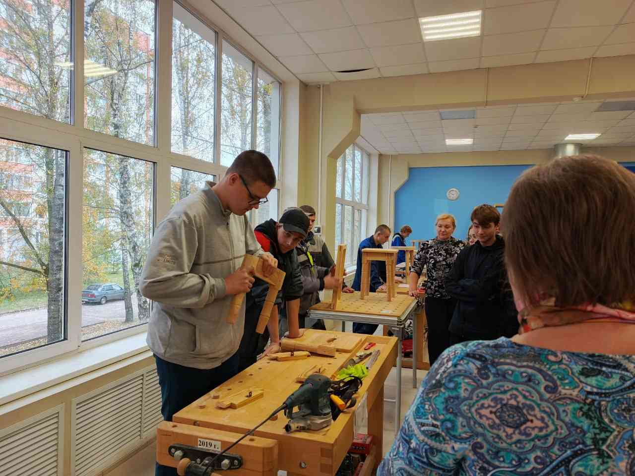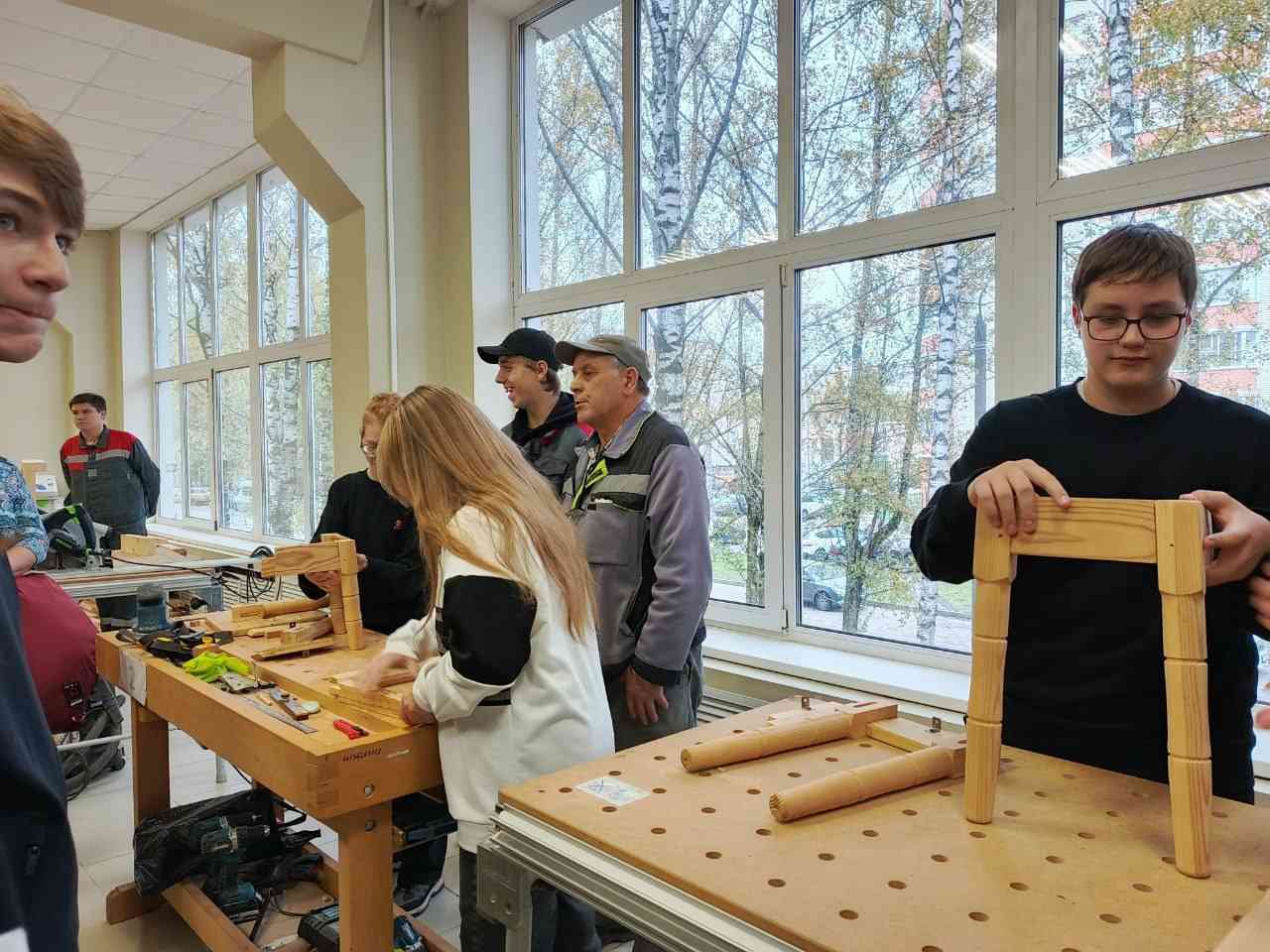 Также учащихся 8 классов приняли участие в мастер-классе по направлению "Столярное дело". Латыпов Ф.М., мастер производственного обучения, рассказал гостям процесс создания табуретов различных видов. Школьники с удовольствием самостоятельно попробовали разобрать и собрать изделия из дерева: табурет, рамы для фото и оконную раму.