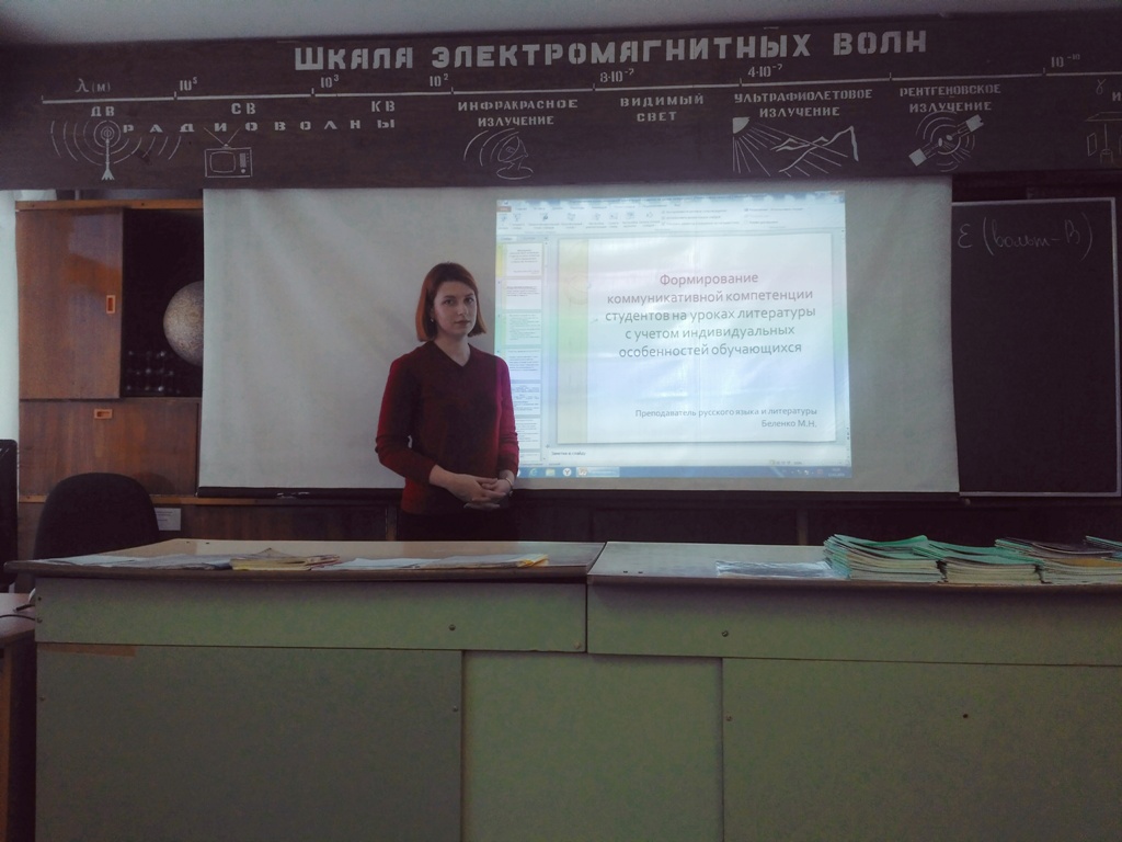 12 февраля на площадке №2 состоялось заседание цикловой комиссии общеобразовательных дисциплин. С докладом по теме самообразования выступила преподаватель русского языка и литературы Беленко М.Н., которая поделилась с коллегами результатом работы по формированию коммуникативной компетенции у студентов колледжа. Развитие речевых навыков будущих специалистов является одной из главных задач учебного процесса, поскольку является одним из основных условий действительного развития и самореализации личности в профессиональной сфере и в обществе. В докладе были рассмотрены основные методы и приемы работы по улучшению качества речи студентов, навыков общения в коллективе, повышению мотивации к учебным предметам, развитию исследовательских и творческих способностей обучающихся.