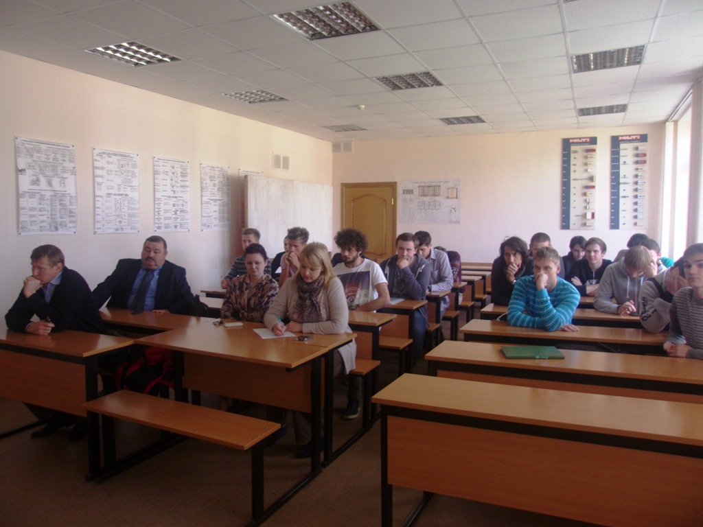 27 октября 2015 г в рамках 75-летия профессионального образования обучающиеся групп А-1-13 и СУ-1-14 с классными руководителями Л.В. Божок и Т.П. Яренской встретились с выпускником Смоленского строительного колледжа Георгием Бенцманом. Он рассказал о своей работе после окончания колледжа в ОАО «Смоленский промстройпроект» архитектором второй категории. Георгий Игоревич рассказал о своей работе, он представил презентацию о последних проектов института – ТРК «Галактика», о квартале жилых домов по ул 8 Марта, и др. Обучающиеся внимательно слушали и задавали вопросы о работе и планах на будущее.