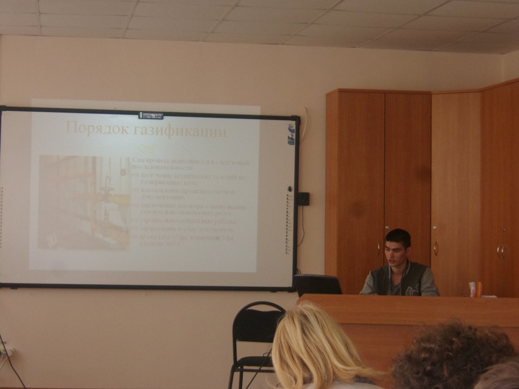 06 октября 2015 года состоялась техническая конференция по итогам производственной практики в группе МГ-1-12 специальности 08.02.08 Монтаж и эксплуатация оборудования и систем газоснабжения. На конференции присутствовали:начальник службы АДС АО «Газпром газораспределение Смоленск» М.А.Остафийчук , руководитель учебно-производственных практик С.В.Сафонова, председатель цикловой комиссии специальностей 08.01.10, 08.02.01, 08.02.08 Е.Ф.Фомина, ведущий преподаватель Г.И.Бедердинов, преподаватель дисциплин профессионального цикла Ж.В.Фирсова.