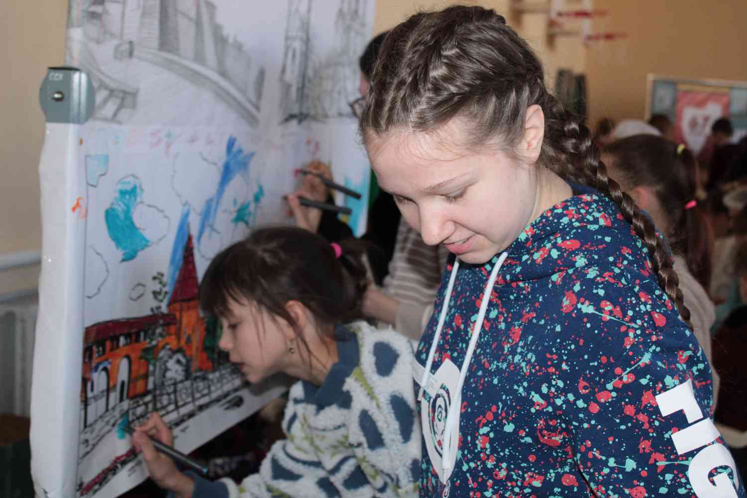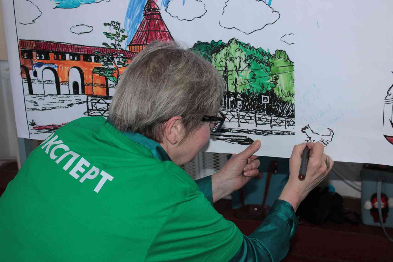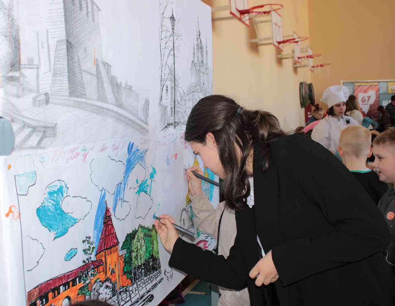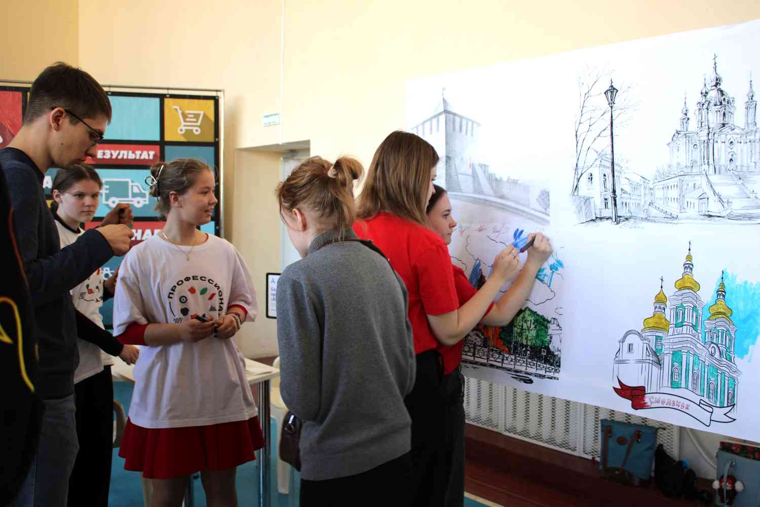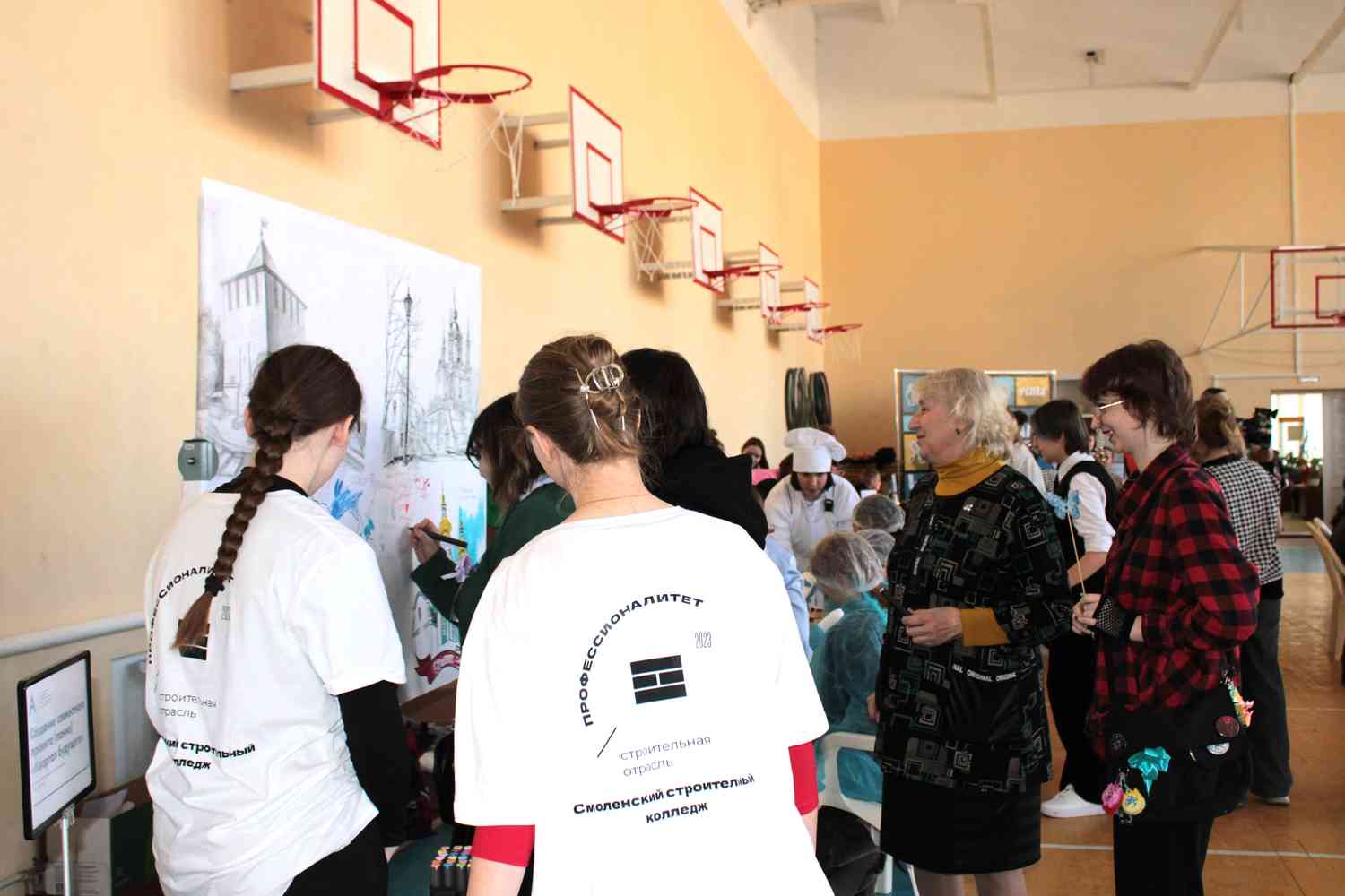 Активное участие в проведении профориентационной программы приняли преподаватель Ерощенкова И.Б. и студенты специальности «Архитектура» Вагапова Д. и Маслобойникова В. Вместе с гостями чемпионата они создавали панно «Квартал будущего».