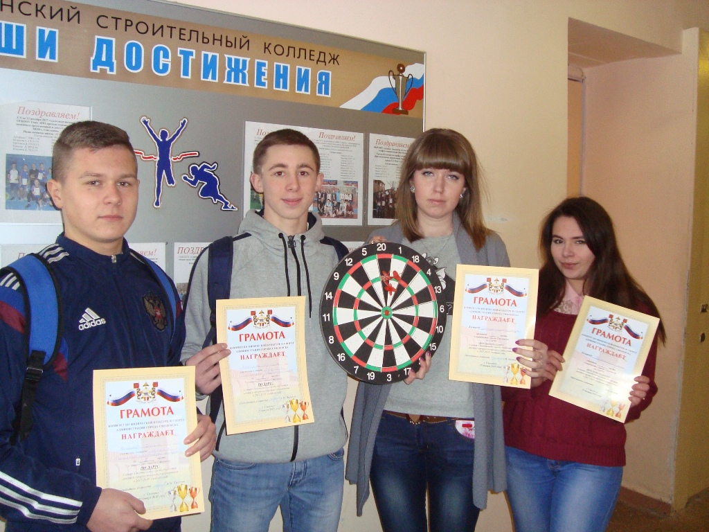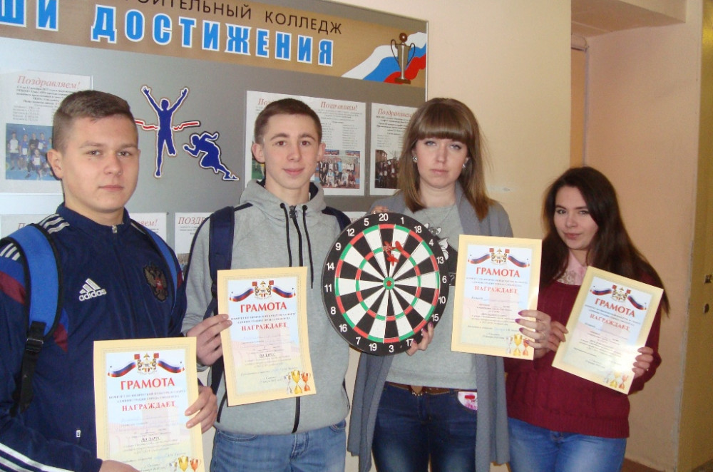 17 октября 2018 года в Смоленском государственном университете прошли соревнования по дартсу в зачет Спартакиады обучающихся ПОО г. Смоленска. В упорной борьбе юноши в составе Ващенкова Д. и Козичева А.(СУ-1-17) заняли I место! Девушки в составе Смирновой Д. и Луневой Е.(А-1-17) так же заняли I место! Поздравляем ребят с победой, а преподавателей Н.Л. Прудникову и Н.Н. Кандалову с отличным выступлением команд!