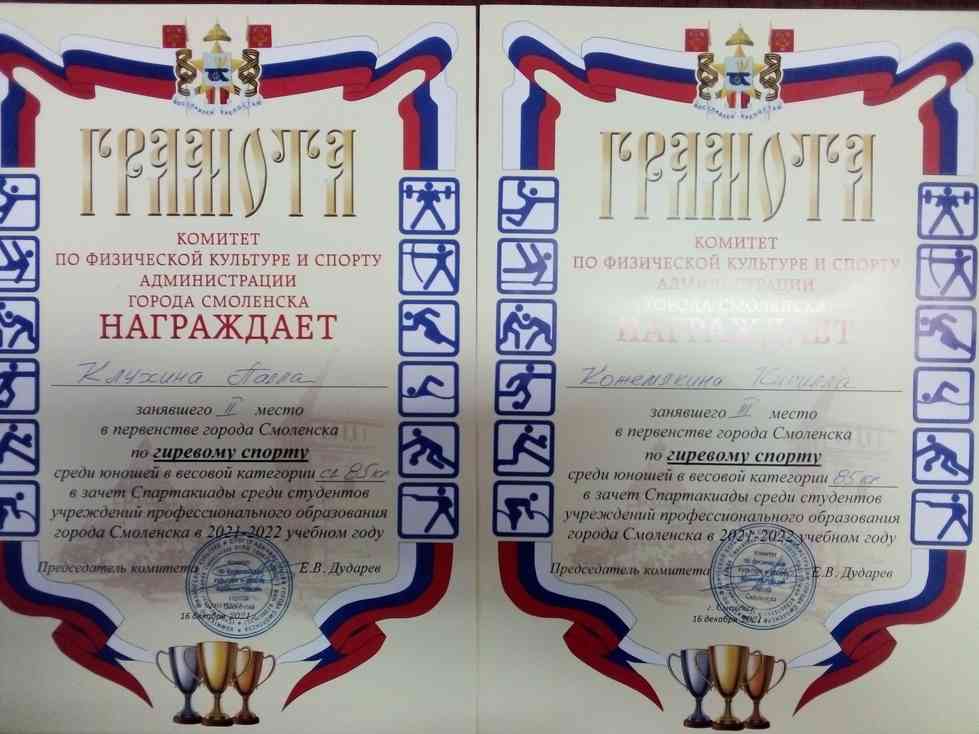 С 16 декабря 2021 года в спортивном зале МБУ «Спортивная школа №1» прошли соревнования по гиревому спорту в зачет Спартакиады обучающихся профессиональных образовательных организаций г.Смоленска. В упорной борьбе студенты первого курса заняли места в личном первенстве: Клухин Павел (С-1-11-21) занял II место и Кожемякин Кирилл (МГ-1-21) занял III место! Поздравляем ребят с отличным выступлением и пожелаем им дальнейших успехов!