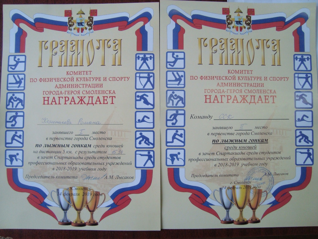 14 февраля 2019 года в парке Реадовка прошли соревнования по лыжным гонкам в зачет спартакиады обучающихся профессиональных образовательных организаций г. Смоленска. Команда колледжа в составе Колесникова Р. (СУ-1-16, 1 место лично), Степанова А.(СУ-11-16), Козичева А.(СУ-1-17), Капитонова М.(СУ-1-17), Болтушина С. (С-18) и Аблогина А. (С-18) заняла II Место! Поздравляем ребят с отличным выступлением!