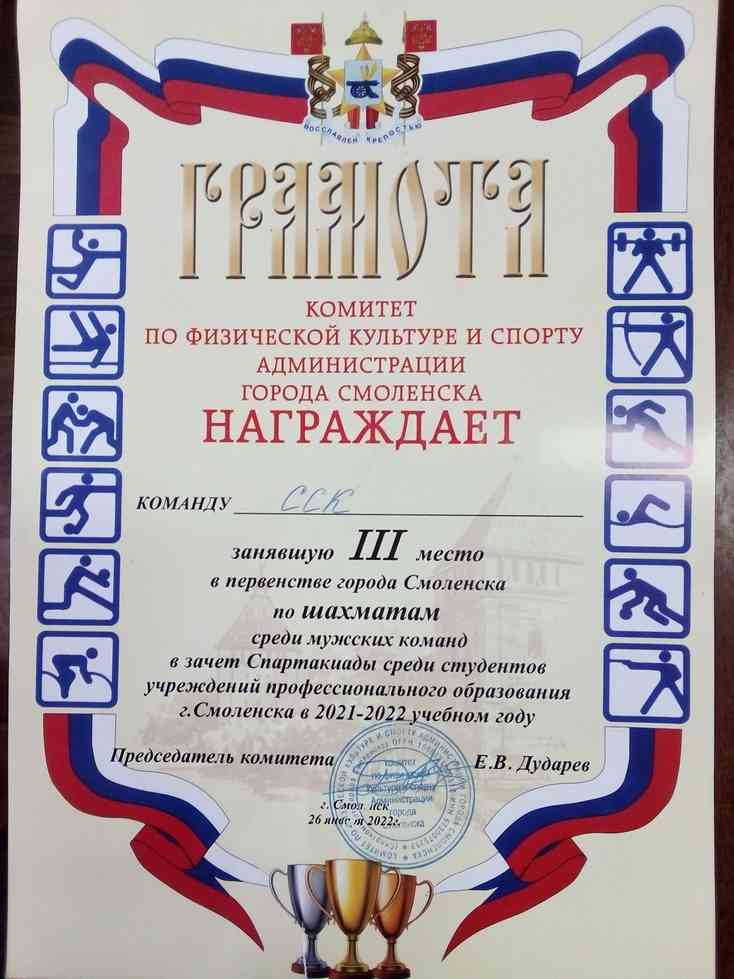 26 января 2022 в СШОР №3 прошли соревнования по шахматам в зачет Спартакиады обучающихся ПОО г. Смоленска. Команда юношей в составе Лаща Дмитрия (СУ-3-21) и Андреенкова Анатолия (СУ-3-21) в упорной борьбе заняли III место! Поздравляем ребят с отличным выступлением и пожелаем им дальнейших успехов!