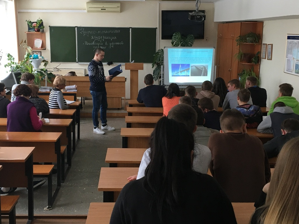 27 октября 2016 года состоялась техническая конференция «Инновации в дорожной отрасли» по итогам производственных практик в группе СД-1-13 специальности 08.02.05 Строительство и эксплуатация автомобильных дорог и аэродромов приуроченная к Дню дорожника, под руководством руководителя учебно-производственных практик С.В Сафоновой и преподавателя дисциплин профессионального курса Л.Е Ивановой.