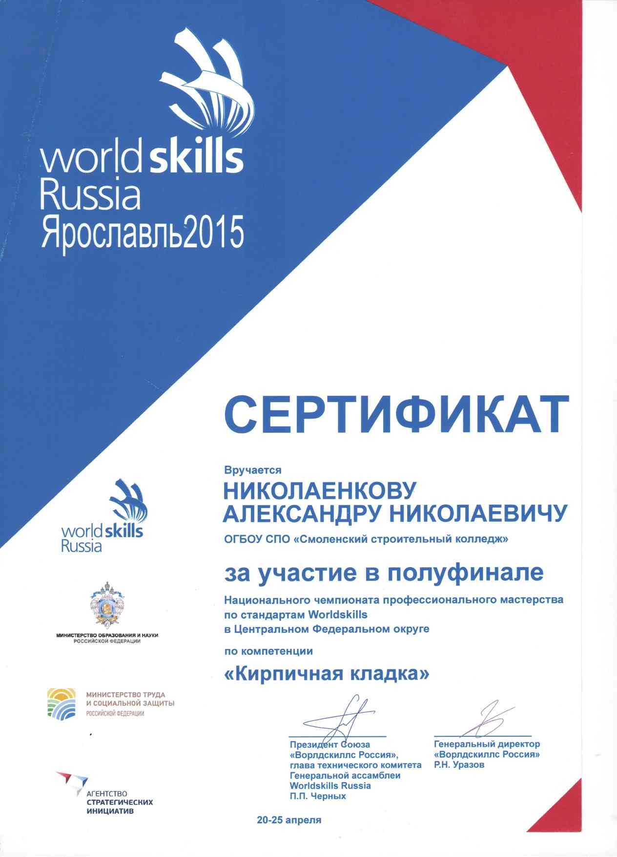 20-25 апреля 2015 года в г.Ярославль состоялся Полуфинал Национального Чемпиона в Центральном федеральном округе по стандартам WorldSkills , в котором приняли участие представители ОГБОУ СПО «Смоленский строительный колледж» .