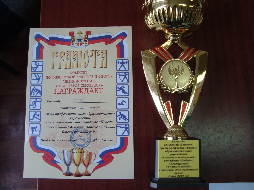 6 мая 2019 года сборная команда колледжа выступила в городской легкоатлетической эстафете, посвященной Дню Победы. В соревнованиях приняли участие школы города, высшие учебные заведения и профессиональные образовательные организации г. Смоленска. По итогам соревнований наша команда заняла II место среди ПОО г. Смоленска! Поздравляем Н.Л. Прудникову и Н.Н. Кандалову с успешным выступлением команды!