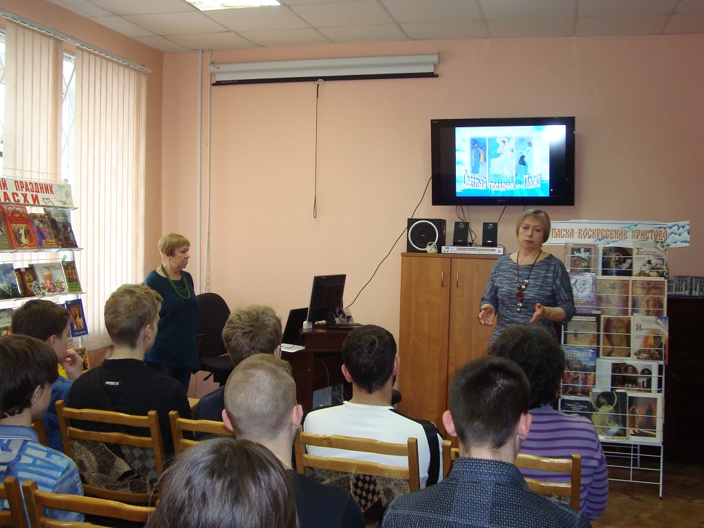 10 апреля 2018 года в праздничные пасхальные дни студенты группы СД-1-17 вместе с классным руководителем Кандаловой Н.Н приняли участие в мероприятии духовно-нравственной направленности, которое состоялось в городской юношеской библиотеке. Название мероприятия определило его содержание «Песни пасхальных колоколов. Произведения искусств». Студенты познакомились с различными видами колокольных перезвонов, с историей и значением колокольного искусства в национальной русской культуре. Большой интерес вызвали произведения искусства, посвященные празднику Пасхи. Это были старинные фрески и иконы, песнопения, а также стихотворные произведения русских классиков. Для нас была организована выставка старинных книг из редкого библиотечного фонда. Считаем, что приобщение к высоким образцам русского духовного искусства будет способствовать расширению кругозора студентов, формированию любви к Родине и к своему народу.