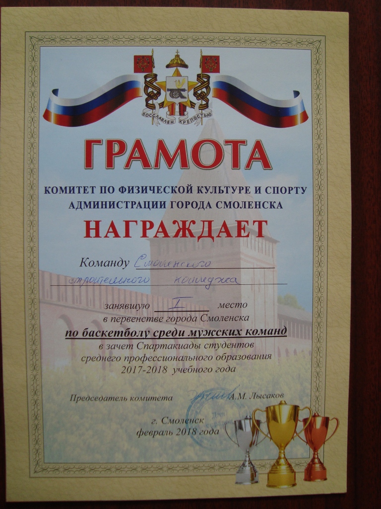 С 20 по 27 февраля 2018 года спортивном зале Смоленской академии профессионального образования прошли соревнования по баскетболу среди мужских команд в зачет Спартакиады обучающихся профессиональных образовательных организаций г. Смоленска. Наша команда в упорной борьбе заняла I место. Поздравляем ребят и тренера команды А.О. Литвишко с победой!