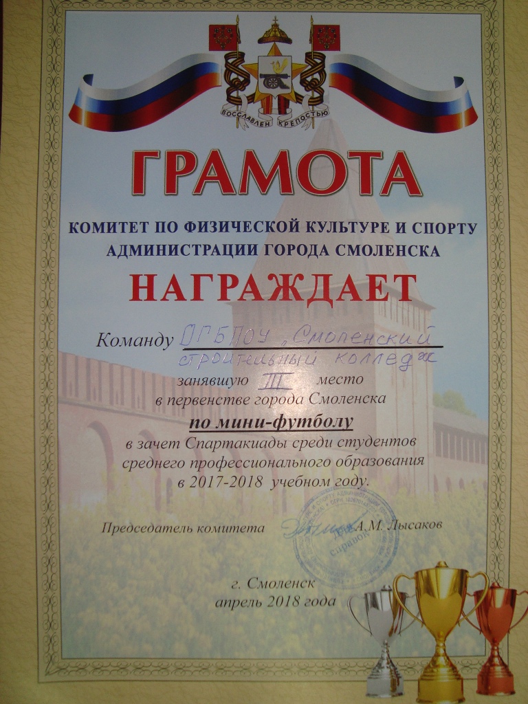 С 10 по 18 апреля 2018 года в спортивном зале СТЖТСиС прошли соревнования по футболу в зачет Спартакиады обучающихся профессиональных образовательных организаций г. Смоленска. Наша команда в упорной борьбе заняла III место. Поздравляем ребят и Н.Л. Прудникову с успешным выступлением команды.