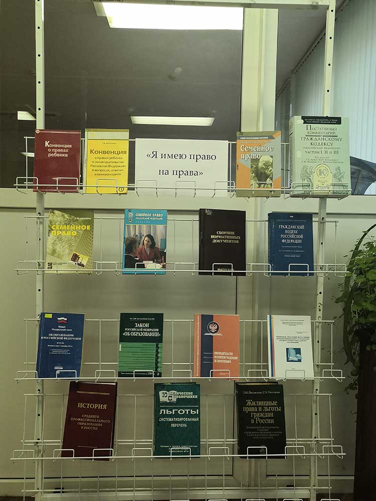 В библиотеке колледжа была организована выставка нормативной литературы" Я имею право на права» выставочные материалы были доступны для обучающихся в течение всей недели правовых знаний.