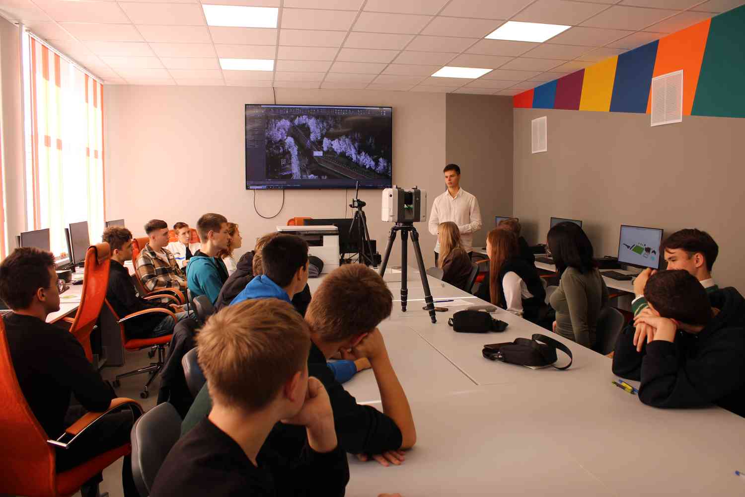 В преддверии самой контрольной работы состоялся мастер-класс «Облако точек или как работает лазерный сканер», который провел для участников преподаватель Я.Д. Анищенко. Ребята познакомились с работой лазерного сканера и продуктами цифрового строительства, разработанными нашими студентами.