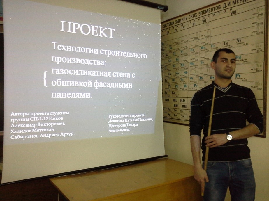 По оценкам жюри первое место получил проект: «Технология строительного производства: газосиликатная стена с обшивкой фасадными панелями»,