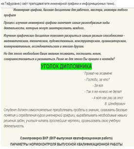 Преподавателем Гайворонюк Еленой Гафуровной был создан мини-сайт «Уголок дипломника» в социальной сети работников образования nsportal.ru, на котором размещены материалы: Образцы оформления ВКР; Нормоконтроль в помощь студентам, а также алгоритм самопроверки выпускной квалификационной работы (ВКР):