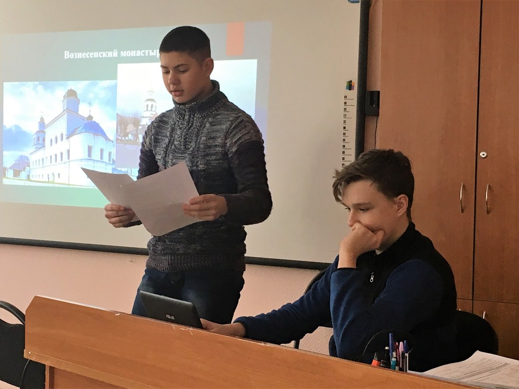 Прищеп Александр (СУ-3-18) посвятил выступление храмам Смоленска, Белоусов Андрей (СУ-3-18) рассказал об Успенском соборе, Глазунов Руслан (СУ-2-18) – о героях Смоленской земли, Романова Каролина (СУ-2-18) об усадьбе «Хмелита».