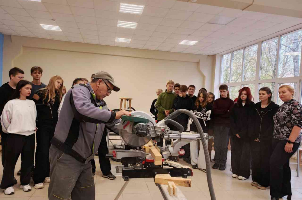 Также учащихся 8 классов приняли участие в мастер-классе по направлению "Столярное дело". Латыпов Ф.М., мастер производственного обучения, рассказал гостям процесс создания табуретов различных видов. Школьники с удовольствием самостоятельно попробовали разобрать и собрать изделия из дерева: табурет, рамы для фото и оконную раму.