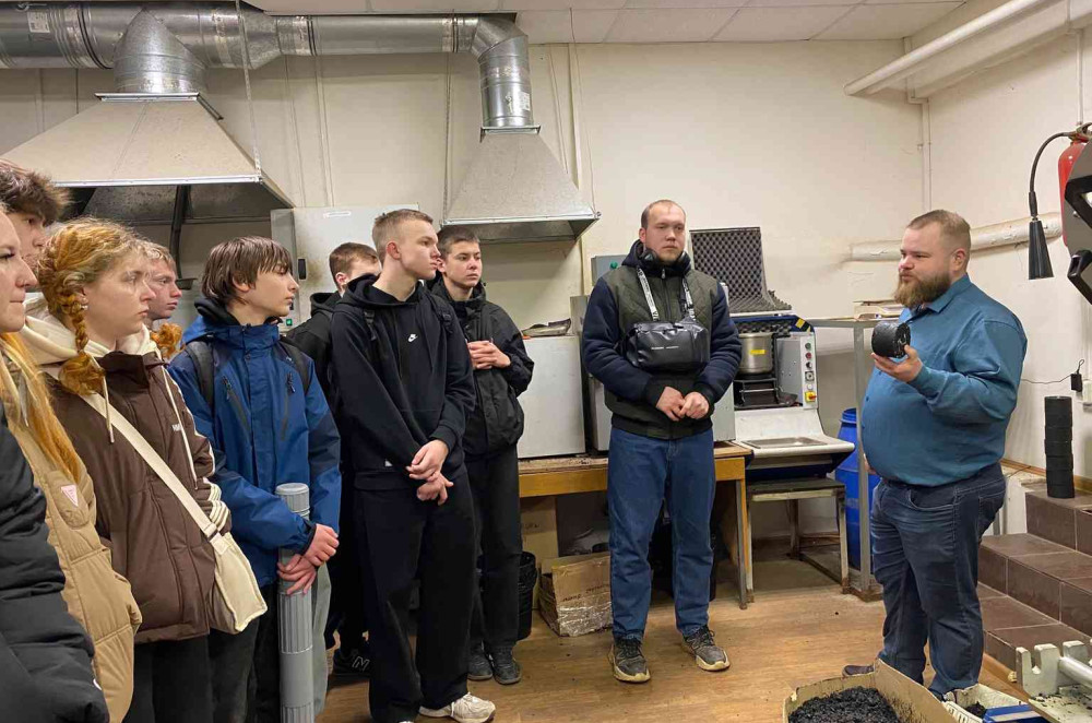 Начальник отдела контроля качества, возглавляющий испытательную лабораторию, Артем Дмитриевич Боздуха рассказал студентам об асфальтобетонной смеси не просто как о сыпучим материале, а как о результате кропотливой работы и точного расчета.